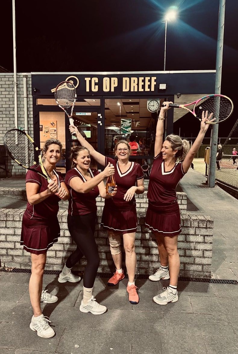 Het damesteam 3e klasse donderdagavond won al zijn wedstrijden en zijn onze eerste kampioenen. Op de foto Suzan Brouwers, Maartje Verhees, Angelique Bouma en Sarah Smulders. Christel van Dieren was er helaas niet bij en Evelien Meyer moest geblesseerd toekijken.