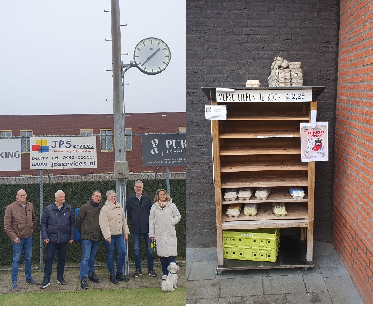 Het viel iedereen die de laatste dagen op onze banen was onmiddellijk op, in de lichtmast bij baan 2 hangt nu een voor iedereen zichtbare klok! Zo'n klok op de banen is een wens die onze vereniging al lang heeft maar het kwam er maar niet van en dat had zeker ook te maken met de aanschafkosten. Marco en Annelies lieten onze wens in vervulling gaan en daar zijn we heel blij mee. Hoe zit dat? Aan de Ferdinand Bolstraat 48 staat een eierrek waar iedereen eitjes kan kopen (zie de foto) en alles wat Marco en Annelies hiermee verdienen gaat naar een goed doel. Een geweldig initiatief dat je ook kunt volgen op hun Facebookpagina. Marco en Annelies hebben hier al veel goede doelen mee kunnen helpen en nu dus ook TPC Op Dreef. Je weet wel waar je nu je eitjes kunt halen. 🙂 Op de foto een afvaardiging van het bestuur dat de klok van Marco en Annelies (3e en 4e van links) in ontvangst neemt. Jos Maas en Riny van den Heuvel zorgden voor de techniek en de ophangbeugels.